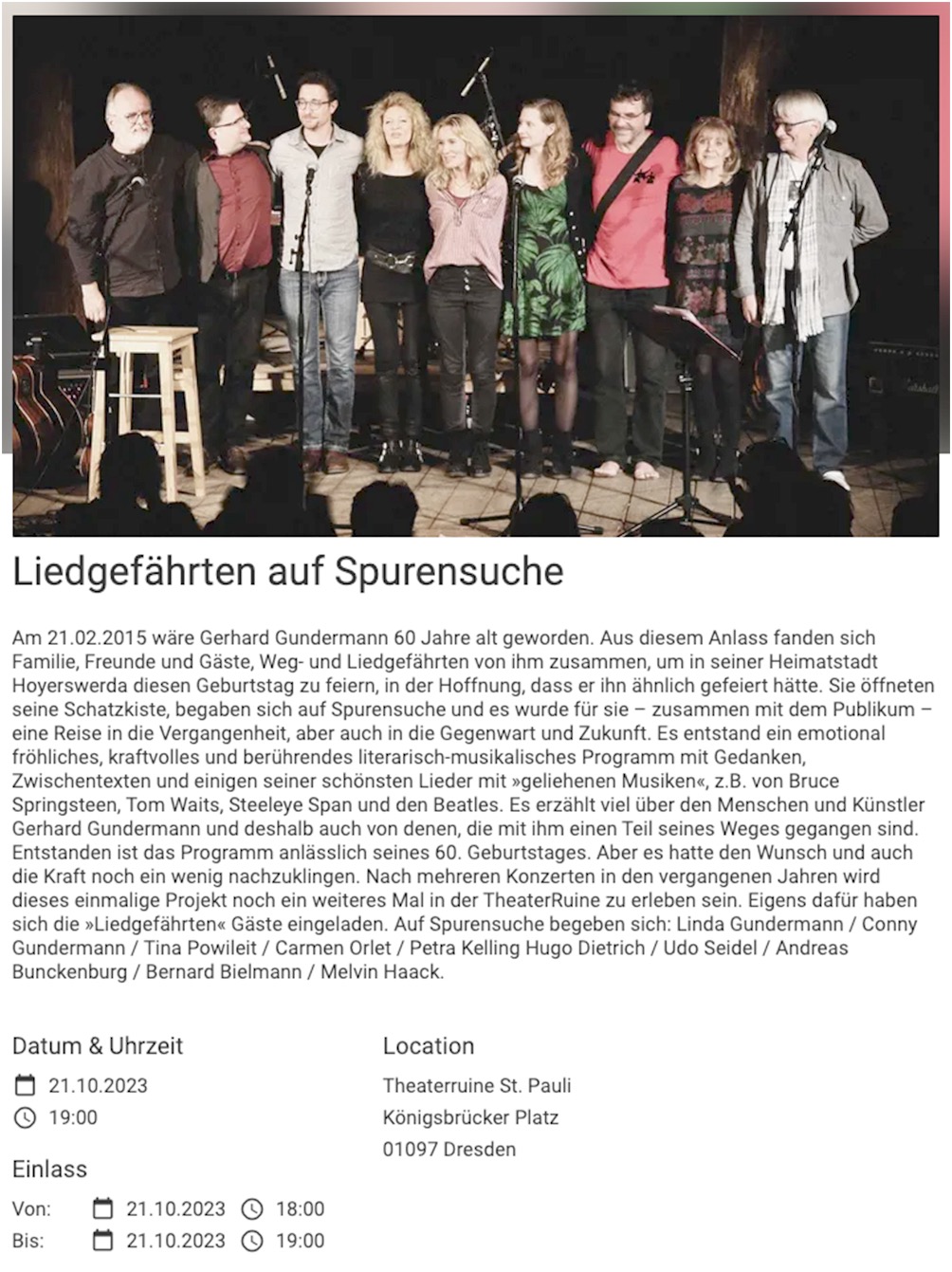 Ein kurzer Gruss in die Runde: Das Jahr hat es leider nicht so gut mit uns gemeint. Leider mussten wir krankheitsbedingt alles Konzerte absagen. Wir können nur auf Euer aller Verständnis hoffen und freuen uns auf ein Wiedersehen im nächsten Jahr. Die Termine werden wir rechtzeitig bekannt geben. Als Start tragen auch wir uns voller Optimismus den 24. Februar 2024 zum Vereinstreffen in der KUFA in Hoyerswerda ein.